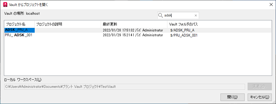 注: 単一のコンピュータからの複数の Vault ログインをサポートするには、[変更]をクリックして、ローカル ワークスペース フォルダを設定します。たとえば、.¥Documents¥Plant Vault Projects_Admin¥ProjectName を管理者ログイン用に設定し、既定のフォルダを別の Vault ログインに使用することができます。[変更]は、プロジェクトを各 Vault ログインで初めて開いたときに有効となります。