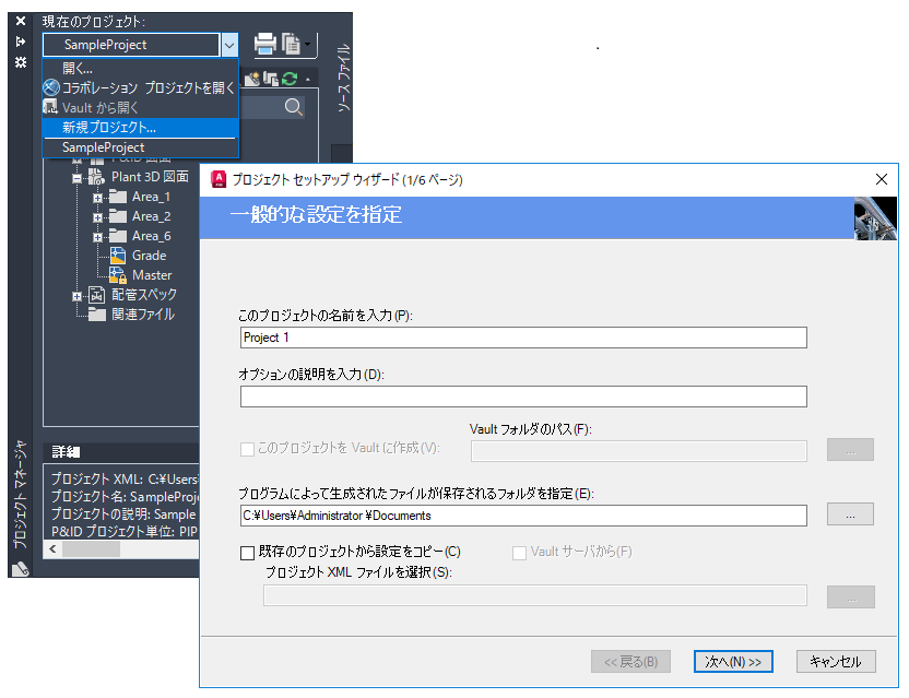 通常、CAD マネージャがプロジェクト テンプレートを設定します。テンプレートとは、会社の標準スペックを満たした構成内容を持つ既成のプロジェクトを指します。CAD マネージャは別のプロジェクトをテンプレートとして指定し、新しいプロジェクトの名前と場所を設定できます。新しいプロジェクトには、テンプレートとして使用されたプロジェクトから設定が継承されますが、この設定は現在の要件を満たすように変更できます。
