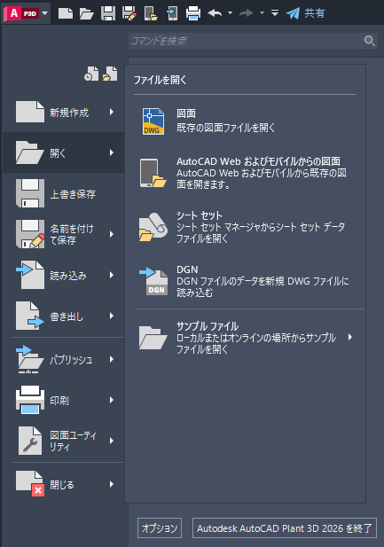 アプリケーション メニューはプログラムの左上に配置されています。 AutoCAD Plant 3D toolsetの前バージョンではこの位置に従来型のメニュー構造が配置されていました。