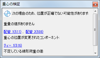 クイック重心が有効で、重量を持っていない Plant オブジェクトを選択した場合、重量のないコンポーネントを識別するための検証ウィンドウが表示されます。クイック重心検証は、重量を持つコンポーネントが 1 つも選択されていない場合、有効にはなりません。