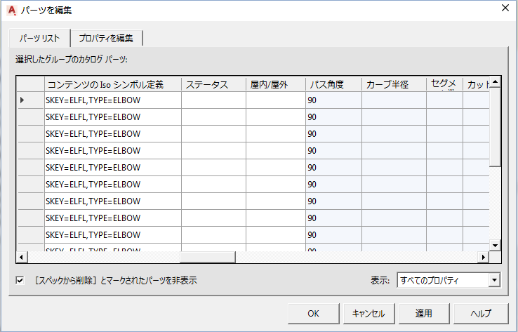 カタログ内のこれらの値を設定し、配管スペックを作成または更新することもできます。