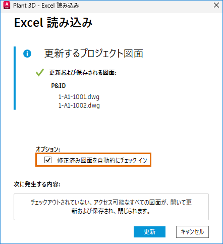 コラボレーション プロジェクトおよび Vault プロジェクトの場合、[Excel 読み込み]ダイアログ ボックスには、読み込みプロセスの終了時に修正済み図面を自動的にチェック インするオプションが含まれています。