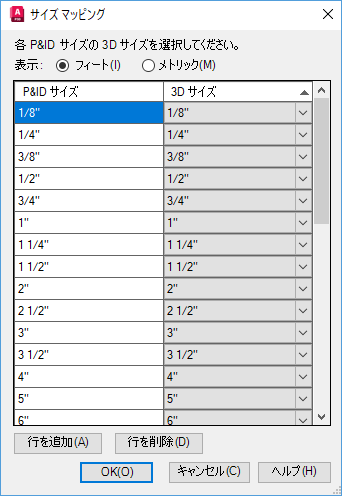 - [P&ID サイズ]列で、サイズ(例: 3/8”)をクリックします。