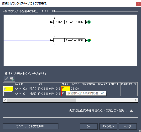 図面内で選択したオフページ コネクタを使用して、接続されている図面のオフページ コネクタを表示し、ハイライト表示されたプロパティの不一致を修正することができます。