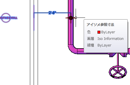 選択またはハイライト表示していない場合、アイソメ参照寸法は配管の中に隠れています。これはアイソメ図注記に似ていますが、アイソメ参照寸法には配管の外側に少し延びた座標線分があります。