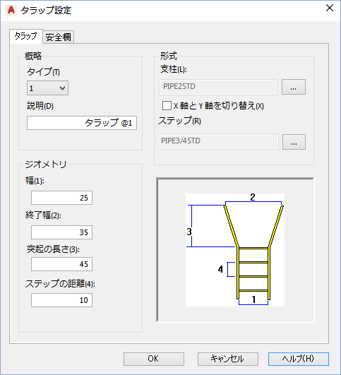 タラップのジオメトリ設定を設定します。括弧内に示されている数値は、プレビュー イメージ内に表示されているジオメトリに対応しています。