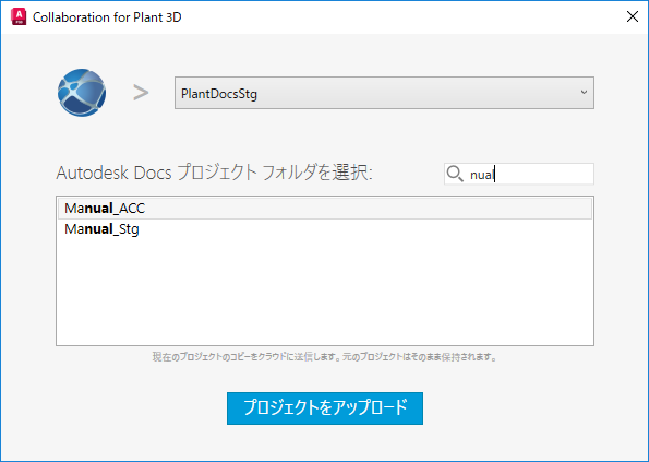 注: プロジェクトが、データベースを含めて、Autodesk Docs プロジェクト フォルダにコピーされます。既存のプロジェクトは変更されず、そのままの状態で保持されます。