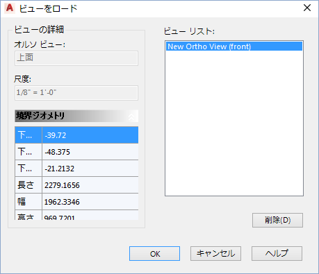 一時図面にロードできる、保存されている使用可能なオルソ ビューの一覧が表示されます。一覧の名前をダブルクリックすると、その名前を変更できます。