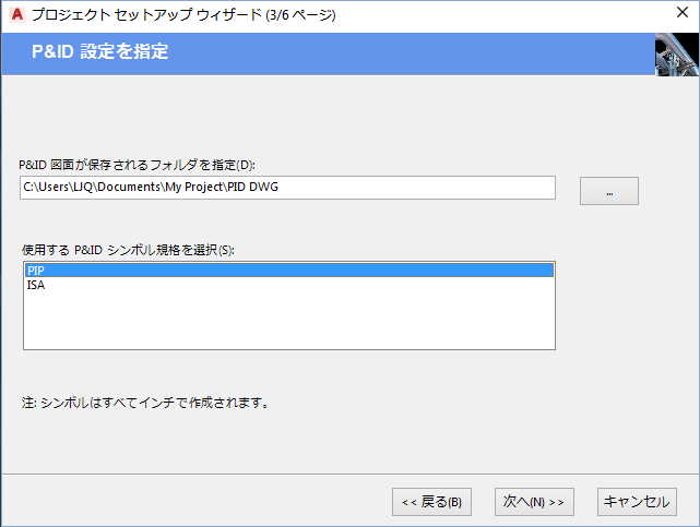 4. [プロジェクト セットアップ ウィザード(3/6 ページ)]で、P&ID 図面のパスを入力し、P&ID ツール パレットの内容の規格を選択します。[次へ]をクリックします。