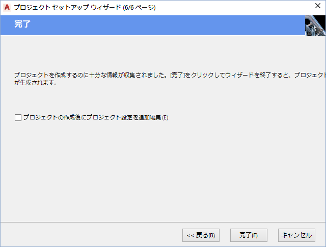 7. [プロジェクト セットアップ ウィザード(6/6 ページ)]で、プロジェクトの既定の設定を変更する場合は、[プロジェクトの作成後にプロジェクトのプロパティを編集]チェック ボックスをオンにします。[完了]ボタンをクリックします。