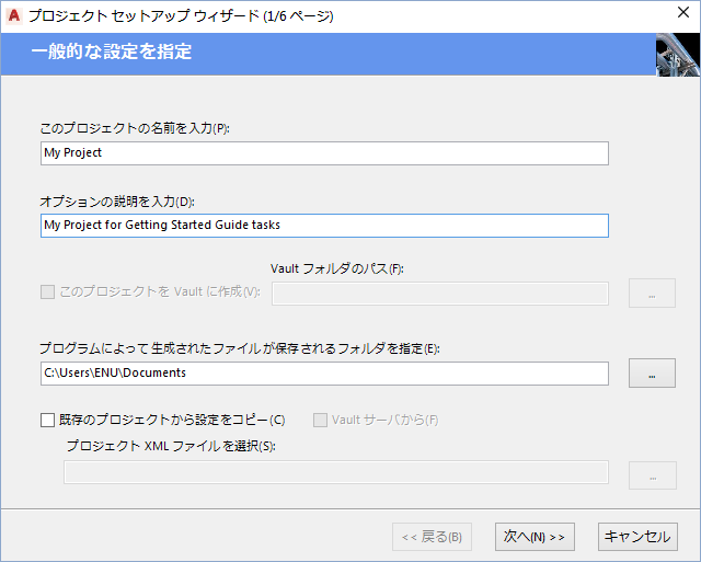 注: 現在のプロジェクトのフォルダ構造を既存のプロジェクトと同じにする場合は、[既存のプロジェクトから設定をコピー]チェック ボックスをオンにし、既存のプロジェクトの場所を指定します。