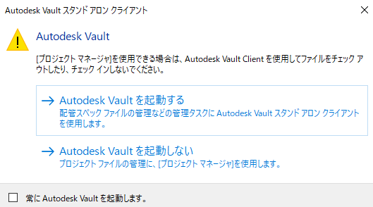 重要: プラント プロジェクトを開くために、Autodesk Vault Client を使用しないでください。初めてプラント プロジェクトを開くには、現在のプロジェクトを閉じ、次に[プロジェクト マネージャ]を使用して Vault からプロジェクトを開きます(plantopenfromvault)。