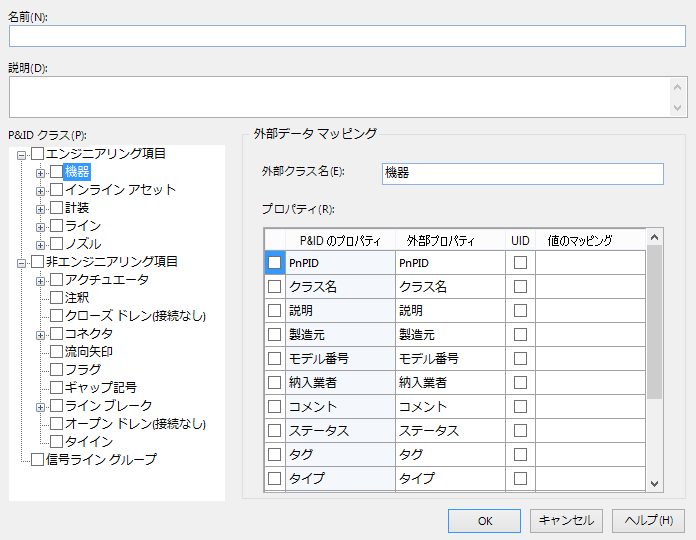 [P&ID のプロパティ]、[外部プロパティ]、[UID]、および[値のマッピング]の4つの列にデータを保持します。