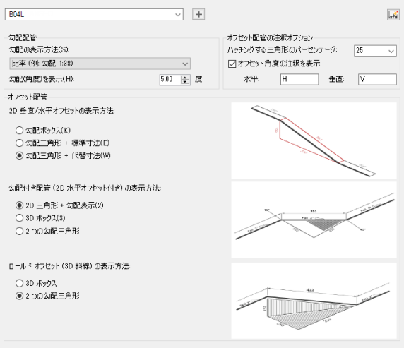 [2D 水平オフセットのある配管の表示方法]領域で、[2D 三角形 + フォール インジケータ]、[3D ボックス]、または[2 つのスキュー三角形]を選択します。