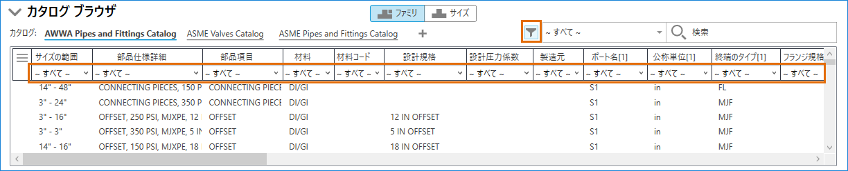 カタログを参照して配管コンポーネントを検索し、コンポーネント(パーツ)を選択してスペックに追加します。