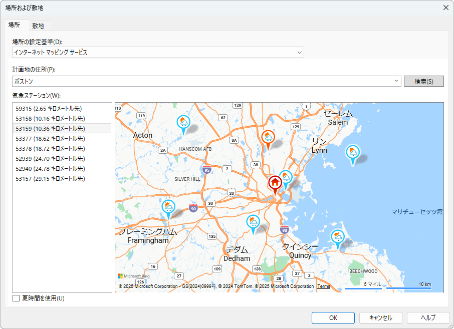 マップ内および左側のリストに使用可能な気象ステーションが表示されます。一般的には、現在地に最も近い気象ステーションを選択します。ただし、標高や風土条件などにおいてモデルの位置をよりよく反映している付近の気象ステーションから選択することもできます。