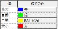 既定の最大と最小のセットに新しい値 - 色ペアを追加すると、その上とその下の色の中間の色(RGB で直線的に決定)が自動的に割り当てられます。次の表に示すように、解析結果によっては、[自動値]に対応する正確な数値は変わります。
