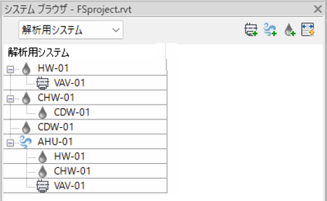 システム ブラウザには、システム ゾーンと解析用システム(水の循環、空調システム、ゾーン設備機器)の階層が表示されます。