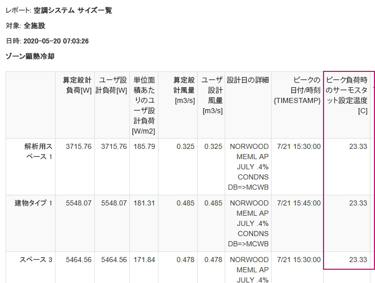 これらの設定点は、システム解析の実行時に使用されます。サイズ設定解析を実行すると、解析レポートの HVAC サイズ設定の概要に、冷房設定温度と暖房設定温度が表示されます。