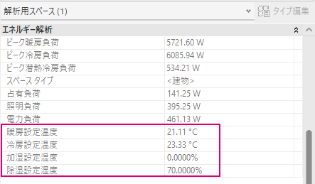 エネルギー モデルを作成すると、[建物タイプ]設定の設定点が解析用スペースに適用され、プロパティ パレットに読み込み専用で表示されます。システム ゾーンに割り当てられた設定点は、システム ゾーンに割り当てられたすべての解析スペースの建物タイプの設定よりも優先されます。