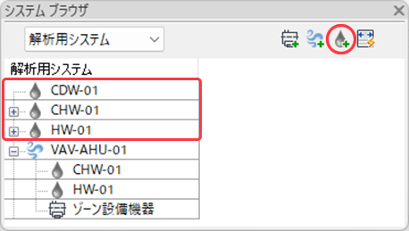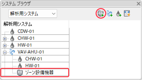システム ブラウザには、システム ゾーンと解析用システム(水の循環、空調システム、ゾーン設備機器)の階層が表示されます。