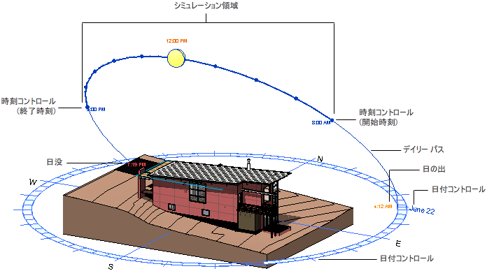| デイリー パス | 指定した日に天空で太陽が通る円弧状のパス。静止モード、1 日モード、複数日モードで表示されます。 | 静止と 1 日: 太陽をデイリー パスに沿ってドラッグして時刻を変更するか、デイリー パス自体をドラッグして日付を変更します。複数日: いずれかのデイリー パスをドラッグし、シミュレーションの開始日または終了日を変更します。 |