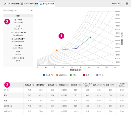 [湿り空気の設計]レポートには、冷却コイルを含む任意のシステムで、空気中の湿り空気の状態ポイントが表示されます。このレポートには、主にシステムの各ポイントにおける空気の状態を確認するための湿り空気のチャートが表示されます