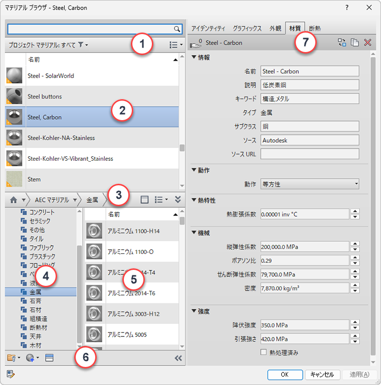 | 7 | ライブラリのリスト(左ペイン)でマテリアルを選択すると、このマテリアルに関連付けられたタブ(アセット)が右ペインに表示されます。マテリアルのプロパティとアセットを表示するには、タブ(たとえば、[識別]または[外観])をクリックします。ライブラリのマテリアルを表示している間、プロパティは読み取り専用になります。 |