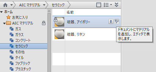ボタンをクリックします。このボタンは、ライブラリのマテリアルをプロジェクトのマテリアル リストに追加します。