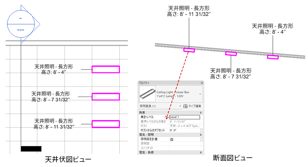 レベルからの高さを 3' 0" に、またはホストからのオフセットを 1' 0" にと、どちらかの値を調整した場合、各パラメータの値は他方の値に基づいて更新されるため、同じ結果になります。