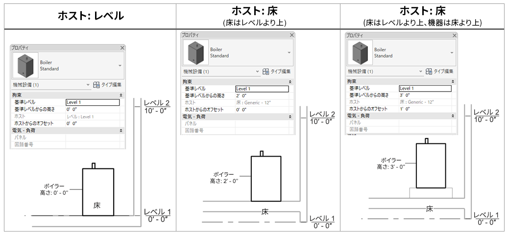 次の例では、床はレベルから 2' 0"(2 フィート 0 インチ)上です。ボイラーが床の上に配置される場合、レベルからの高さ = 2' 0" であり、ホストからオフセット = 0' 0" になります。