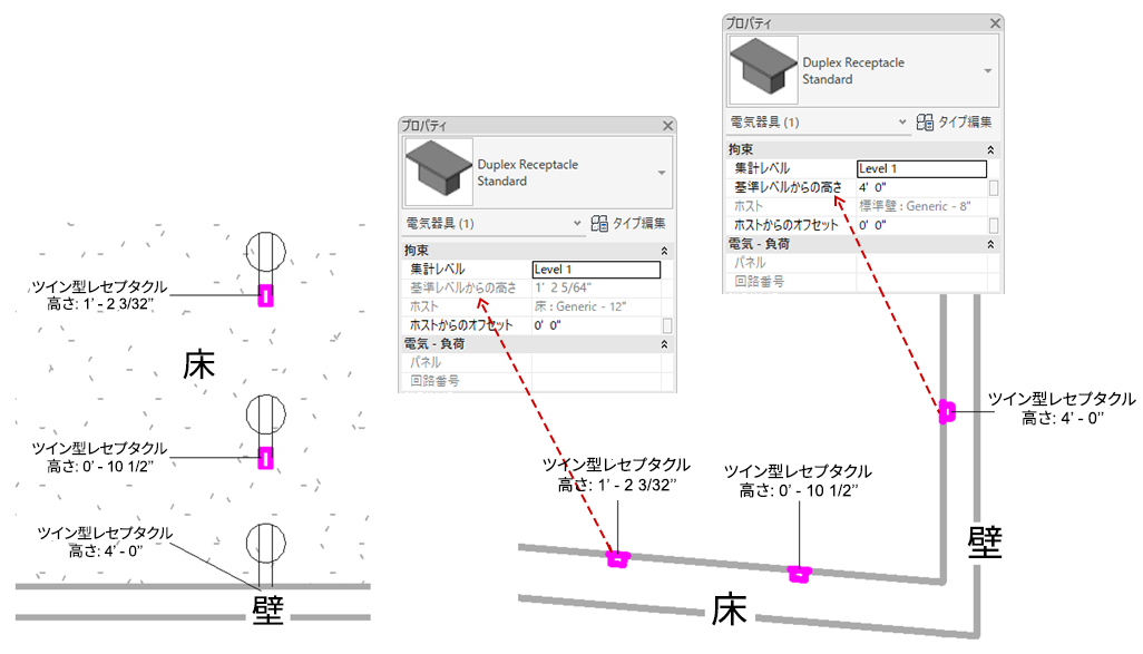 面ベースの要素では、コンセントが壁に配置されている場合など、要素が垂直サーフェスに配置されている場合は、[レベルからの高さ]パラメータを編集できます