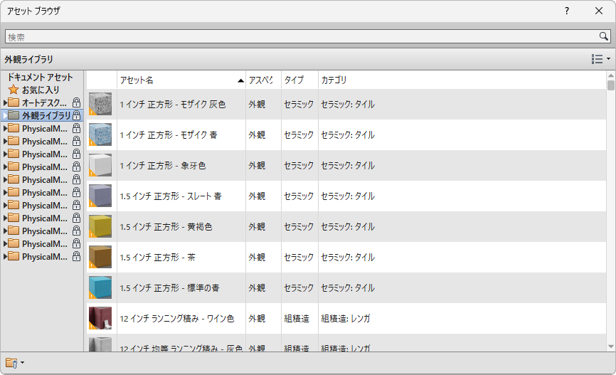 アセットは Revit プロジェクトまたはライブラリに保存されます。Revit プロジェクト内にあってもマテリアルで参照されていないアセットは、[参照されていないアセット]ライブラリに保存されます。Revit セッション中に、必要に応じて参照されていないアセットを作成および編集できます。ただし、セッション中に作成または編集した参照されていないアセットを保存するには、Revit プロジェクトを保存する必要があります。
