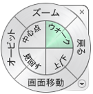 モデル内をウォークまたは「飛行」するとき、移動速度をコントロールできます。移動速度は、カーソルが中心円アイコンから移動される距離および現在の移動速度設定によってコントロールされます。ウォーク ツールを使用するときの移動速度設定を永久または一時的に調整できます。移動速度を永久的に調整するには、SteeringWheels の[オプション]ダイアログ、またはウォーク ツールがアクティブのときに [<] および [>]キーを使用します。ホイールを右クリックしてホイール メニューを表示し、[ウォーク スピードを上げる]または[ウォーク スピードを下げる]を選択することもできます。移動速度を一時的に上げるには、[+] (プラス)キーを押しながら[ウォーク]ツールを使用します。