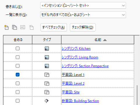 モデルをさまざまな形式に書き出す場合は、[書き出し]ダイアログのツールを使用して、含めるビューとシートを選択します。後で再利用するために、選択したセットを保存します。