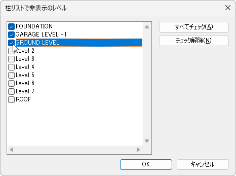 [柱リスト図で非表示のレベル]ダイアログが開き、プロジェクトのレベルがすべてリストに表示されます。