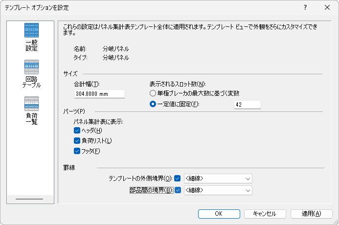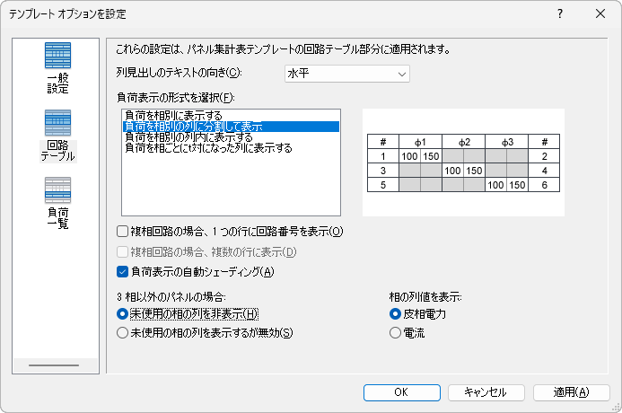 パネル集計表の外観はカスタマイズできます。一般的な表現、回路情報、および負荷リストの設定を行います。