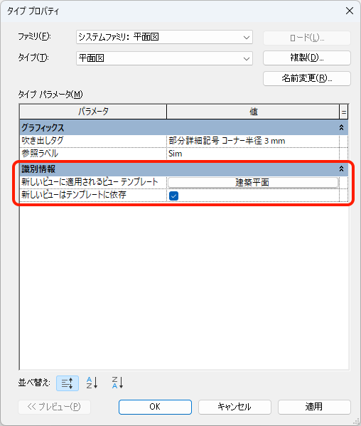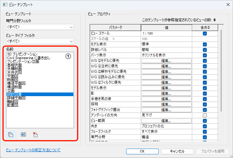 - 新しいビューが作成されたときに適用するビュー テンプレートを設定します。ビュー タイプの識別情報で、ビュー テンプレートが割り当てられます。このタイプの新しいビューが作成されると、テンプレートが自動的に割り当てられます。