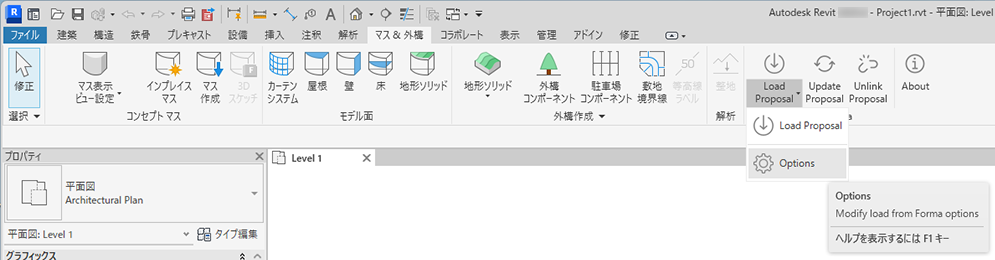 Revit を開き、新しいプロジェクトを作成します。[マス & 外構]タブで、[提案をロード]ボタンを見つけます。