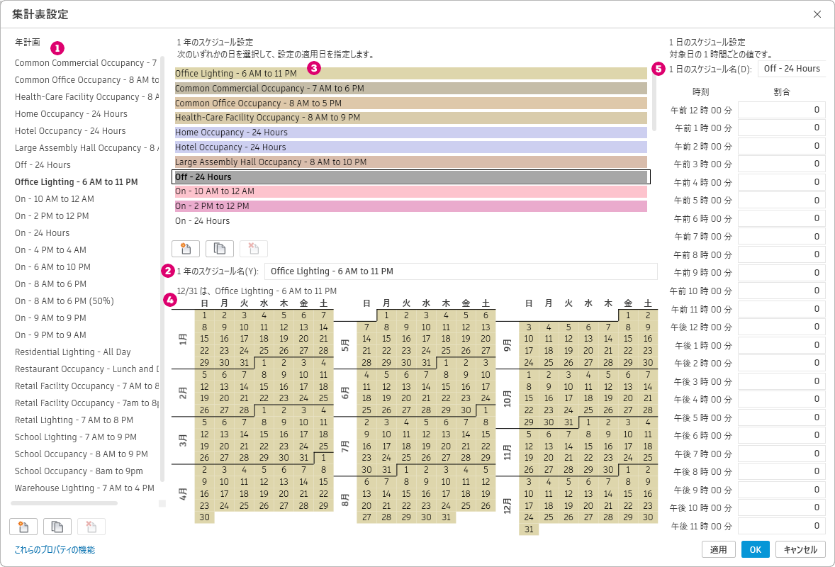 モデル内の建物タイプや各スペースについて、占有スケジュール、照明スケジュール、動力スケジュールを選択することができます。