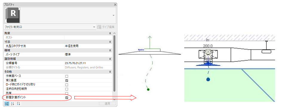 ファミリを編集し、[部屋計算ポイント]を有効にしてから、計算ポイントの位置がスペースの内側に配置されるように移動します。ファミリ エディタのプロパティ パレットで、[部屋計算ポイント]を有効にします。ファミリの部屋計算ポイントの位置がスペースの内側に配置されるように編集します。