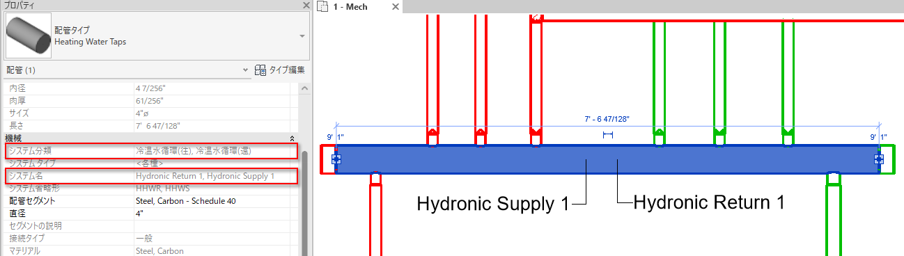2 次ループがタップ接続を使用してヘッダに接続されている場合、ヘッダには 1 次ループの供給システムと循環システムの両方が含まれます。これらのシステムは、下のイメージでタグによって示されているとおり、パイプの中心で分割されます。両方のシステム名とシステム分類は、[プロパティ]パレットに表示されます。