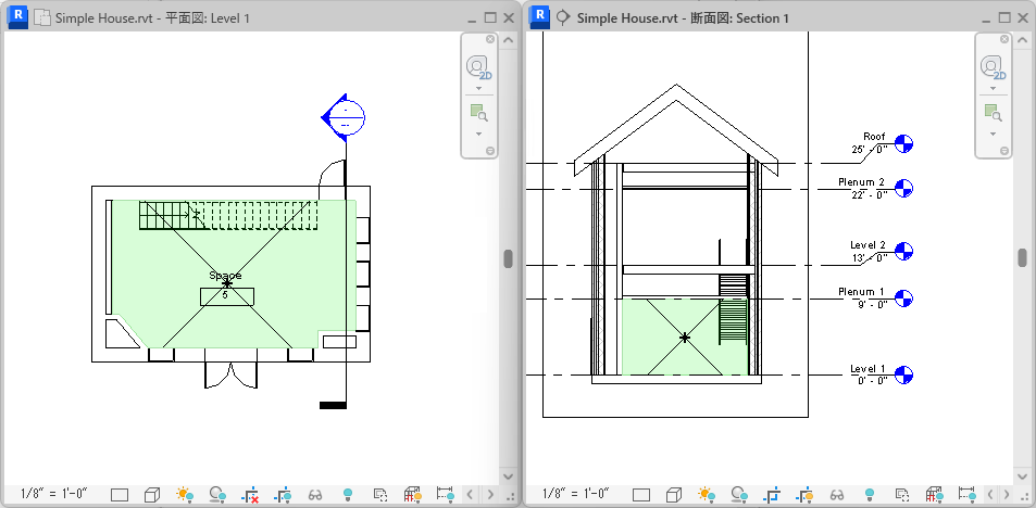 - スペースを配置する断面図および平面図ビュー以外のすべてのビューを閉じ、キーボードで w t と入力して 2 つのビューを並べて表示します。