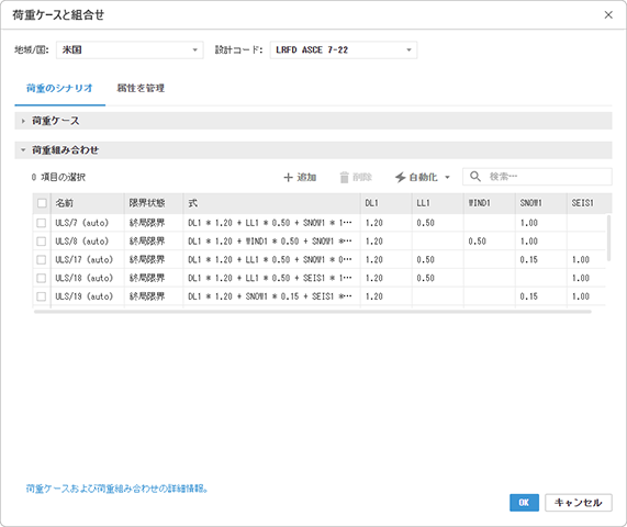 [荷重ケースと荷重組み合わせ]ダイアログを使用して、荷重組み合わせを追加、編集、または削除します。