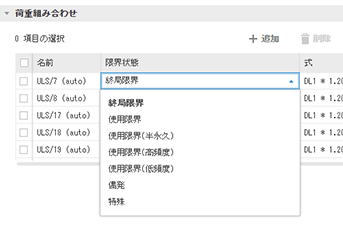[荷重組み合わせ]テーブルの[限界状態]列で、各荷重組み合わせの限界状態を[終局限界]、[使用限界]、[使用限界(半永久)]、[使用限界(高頻度)]、[使用限界(低頻度)]、[偶発]、[特殊]から選択します。