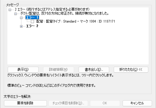 - エラーの見出し(エラー 1 など)を選択します。該当するエラーに関連付けられているすべての要素が作図領域で選択されます。