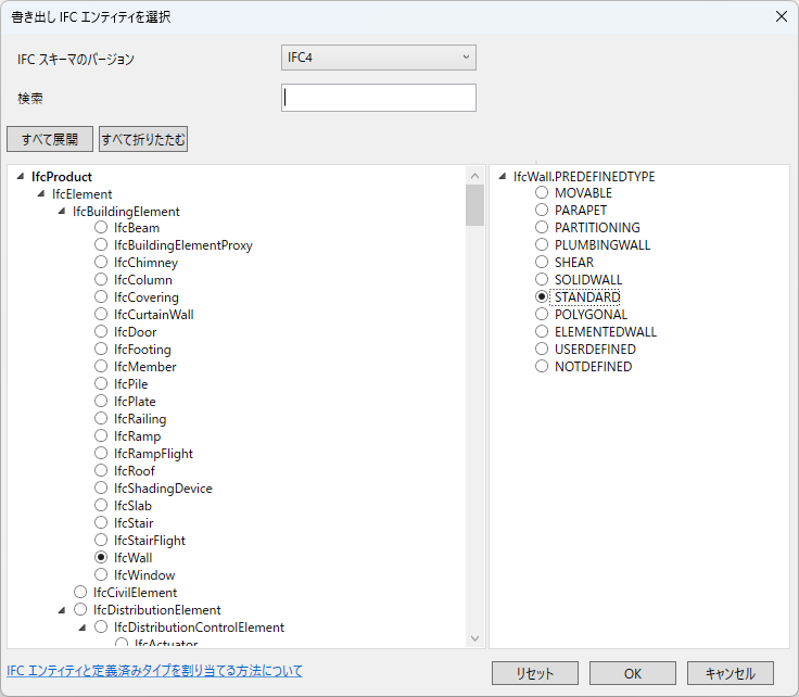 ダイアログを使用すると、IFC エンティティおよび定義済みタイプをファミリ インスタンスおよびファミリ タイプにマッピングすることができます。このダイアログ ボックスでは、IFC スキーマを選択し、特定の IFC エンティティを検索できます。ダイアログでエンティティとタイプを選択すると、これらはモデルの要素のパラメータに適用されます。同じダイアログ ボックスを使用して、IFC 書き出しに含めるエンティティをコントロールします。「ファミリの IFC エンティティを指定する」を参照してください。