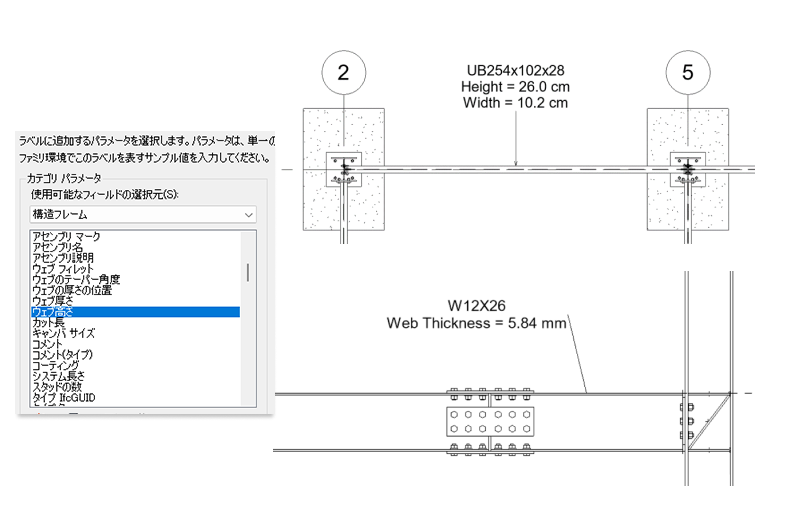 構造断面形状パラメータを使用して、構造フレームのタグ ラベルをカスタマイズします。