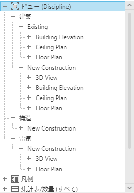 たとえば、専門分野別、フェーズ別、ビュー タイプ別にビューを整理することができます。 また、プロジェクト ブラウザでシート、集計表、数量を整理することもできます。