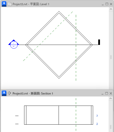 たとえば、次の平面図には、参照面が 2 つ、緑色の破線で表示されています。左側の参照面は切断線に斜めに交差しています。右側の参照面は切断線に垂直に交差しています。斜めの参照面は切断線に対して垂直ではないため、作成される断面図ビューに表示されません。一方、垂直な参照面は断面図ビューに表示されます。